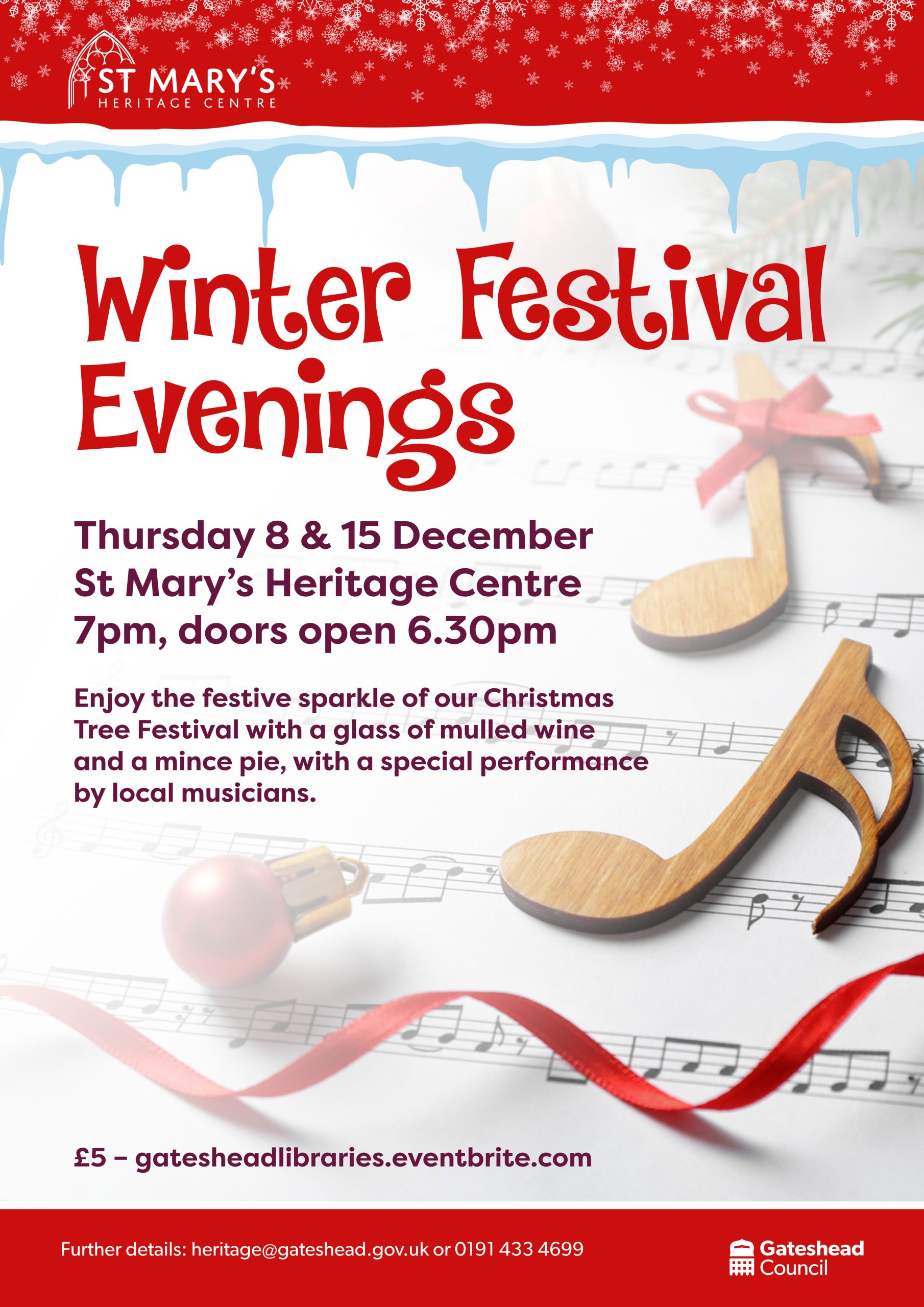 “Enjoy the festive sparkle of our Christmas Tree Festival with a glass of mulled wine and a mince pie, with a special performance by local musicans.”