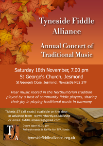 Tyneside Fiddle Alliance - Annual Concert Saturday 18th November, 7.00 pm Tyneside Fiddle Alliance will be celebrating their first months in their new home at St George's Church Hall in Jesmond with a concert in St George's Church. A lovely…